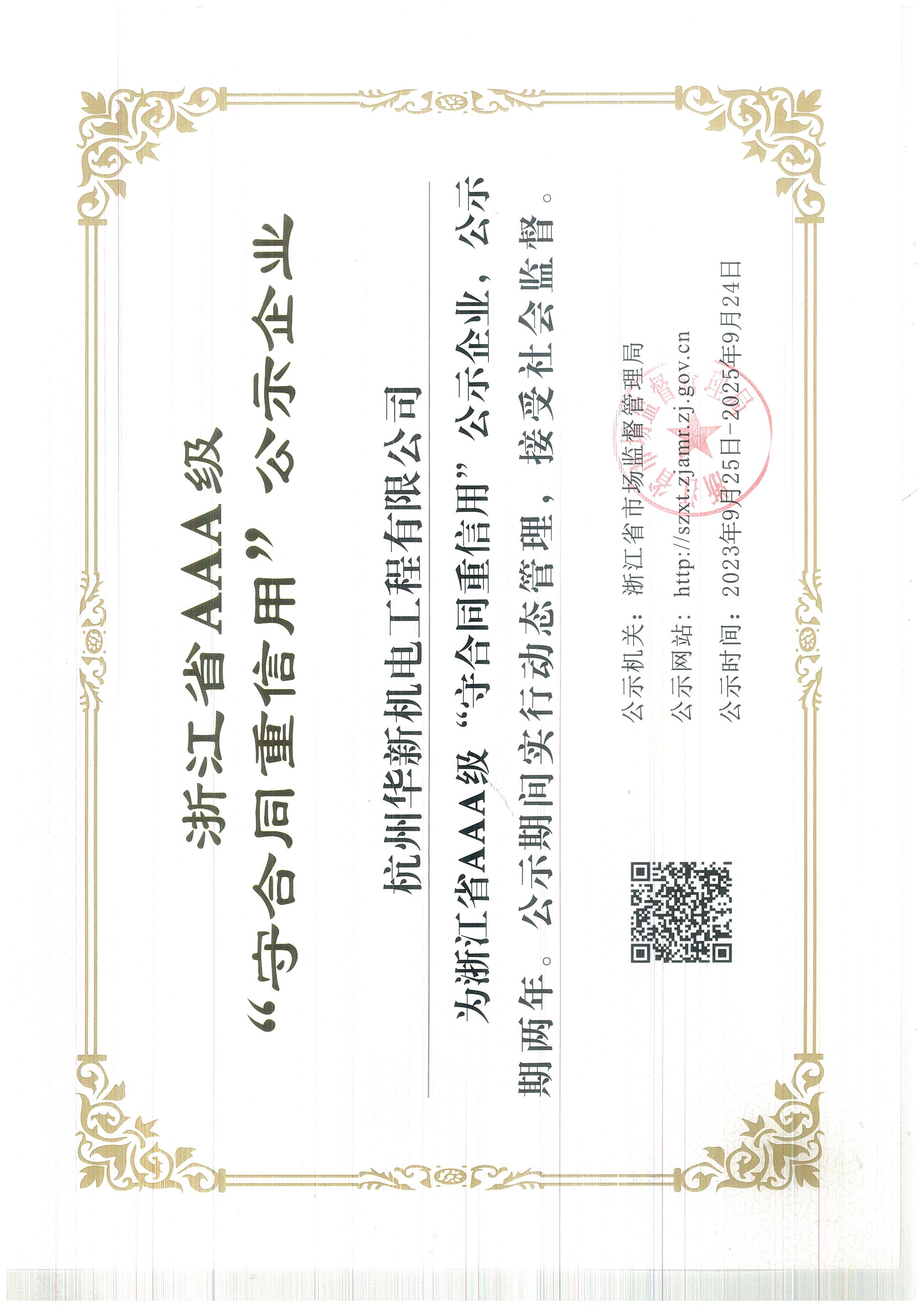 浙江省守合同重信用AAA級(jí)證書